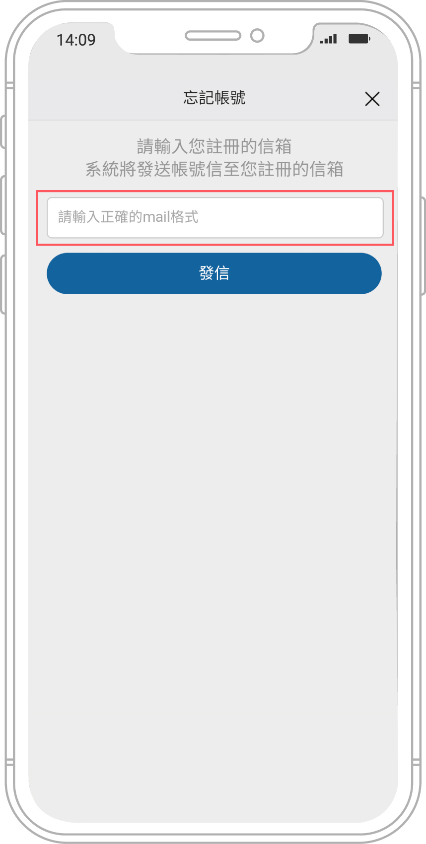 在APP左方選單列,點選進入會員登入頁面,在下方可以利用忘記帳號功能,輸入註冊的【電子信箱】,系統會發送帳號資訊至註冊電子信箱。